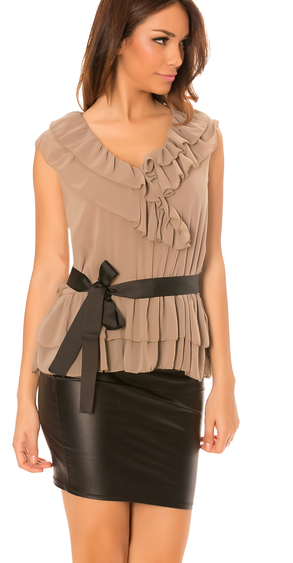 Top taupe en voile avec col cache coeur plissé avec ceinture. très classe pour un look moderne. Taille unique S/M/L